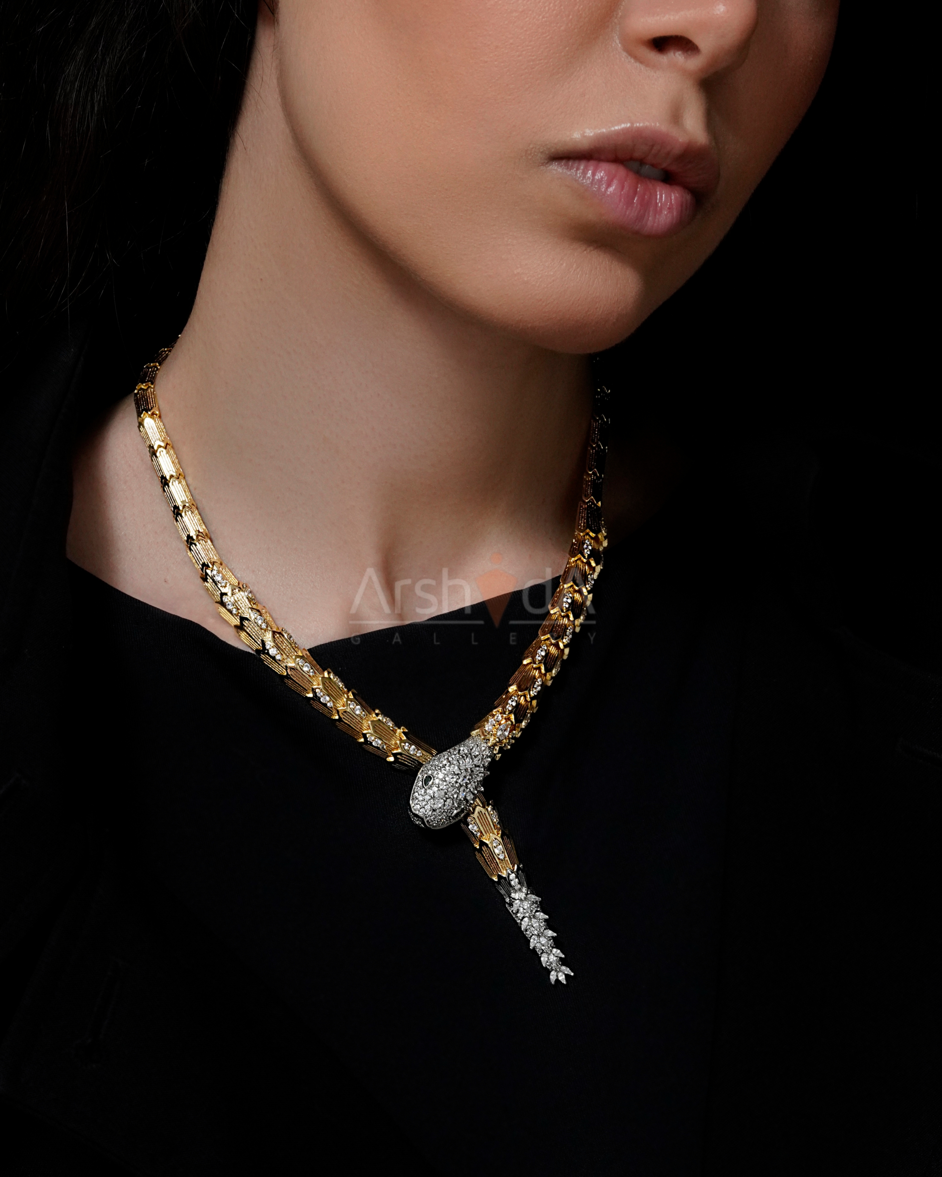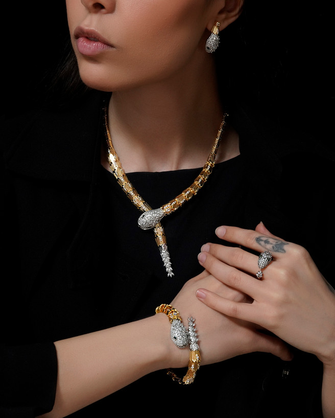 سرویس مار بولگاری یکی از خاصترین مدلهای زیورآلات لوکس به شمار میرود. طرح مار، سمبل قدرت و ظرافت است که در این مجموعه به زیباترین شکل ممکن طراحی شده است. ساختار نرم و منعطف گردنبند و دستبند باعث شده تا این محصول به راحتی روی بدن قرار بگیرد و حس فوقالعادهای را منتقل کند.