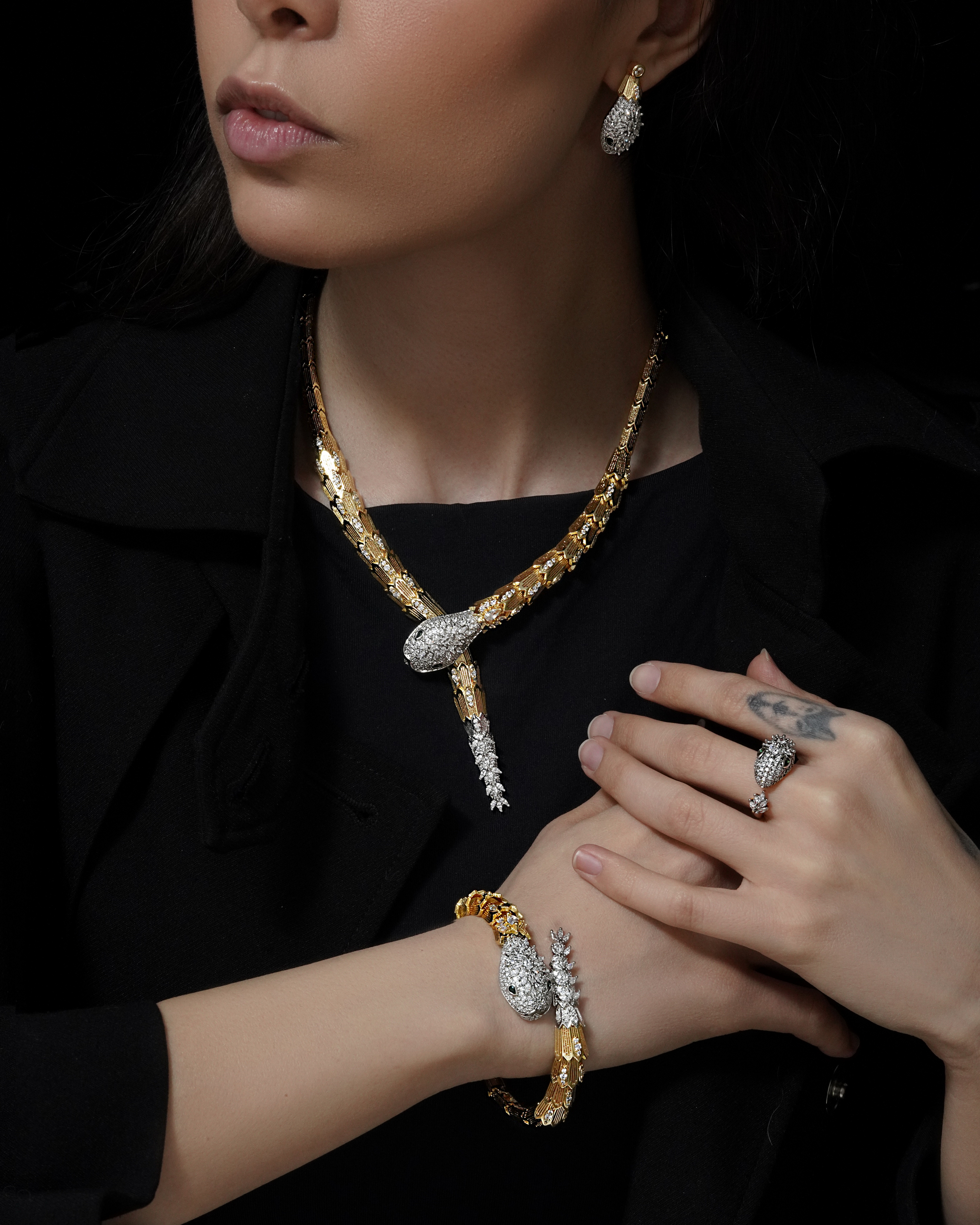 سرویس مار بولگاری یکی از خاصترین مدلهای زیورآلات لوکس به شمار میرود. طرح مار، سمبل قدرت و ظرافت است که در این مجموعه به زیباترین شکل ممکن طراحی شده است. ساختار نرم و منعطف گردنبند و دستبند باعث شده تا این محصول به راحتی روی بدن قرار بگیرد و حس فوقالعادهای را منتقل کند.