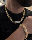 آبکاری طلای ۱۸ عیار و پوشش نانو باعث درخشش بیشتر، رنگ ثابت و مقاومت بالا در برابر خط و خش شده است. با پهنای ۱۲ میلیمتر، جلوهای لوکس و جسورانه به استایل شما میدهد. طول گردنبند ۴۵ سانتیمتر و دستبند ۱۹ سانتیمتر است که با اتصال این دو به هم، میتوان به راحتی یک گردنبند بلندتر نیز ایجاد کرد. این ویژگی، استفاده از این ست را منعطف و هوشمندانه میسازد.