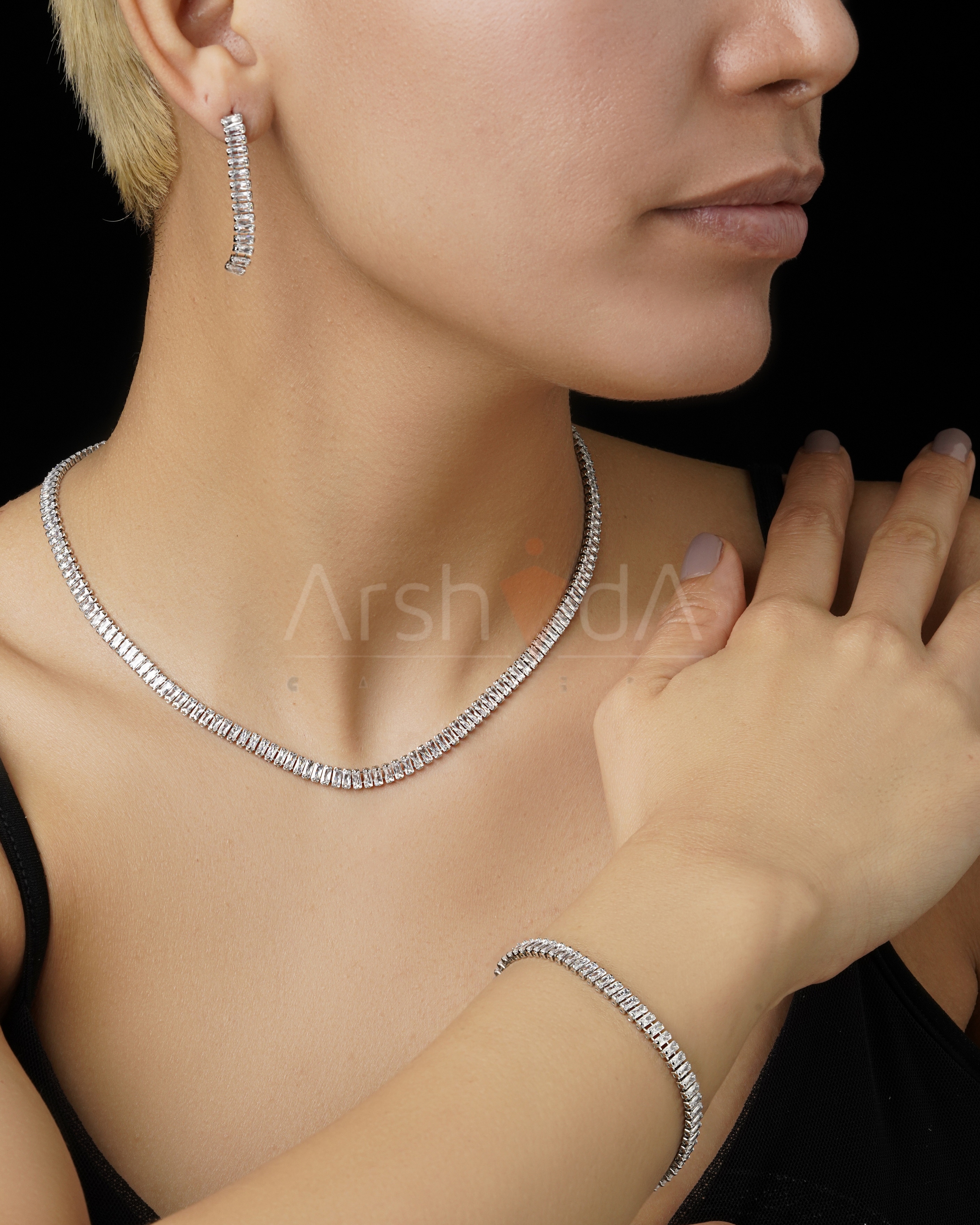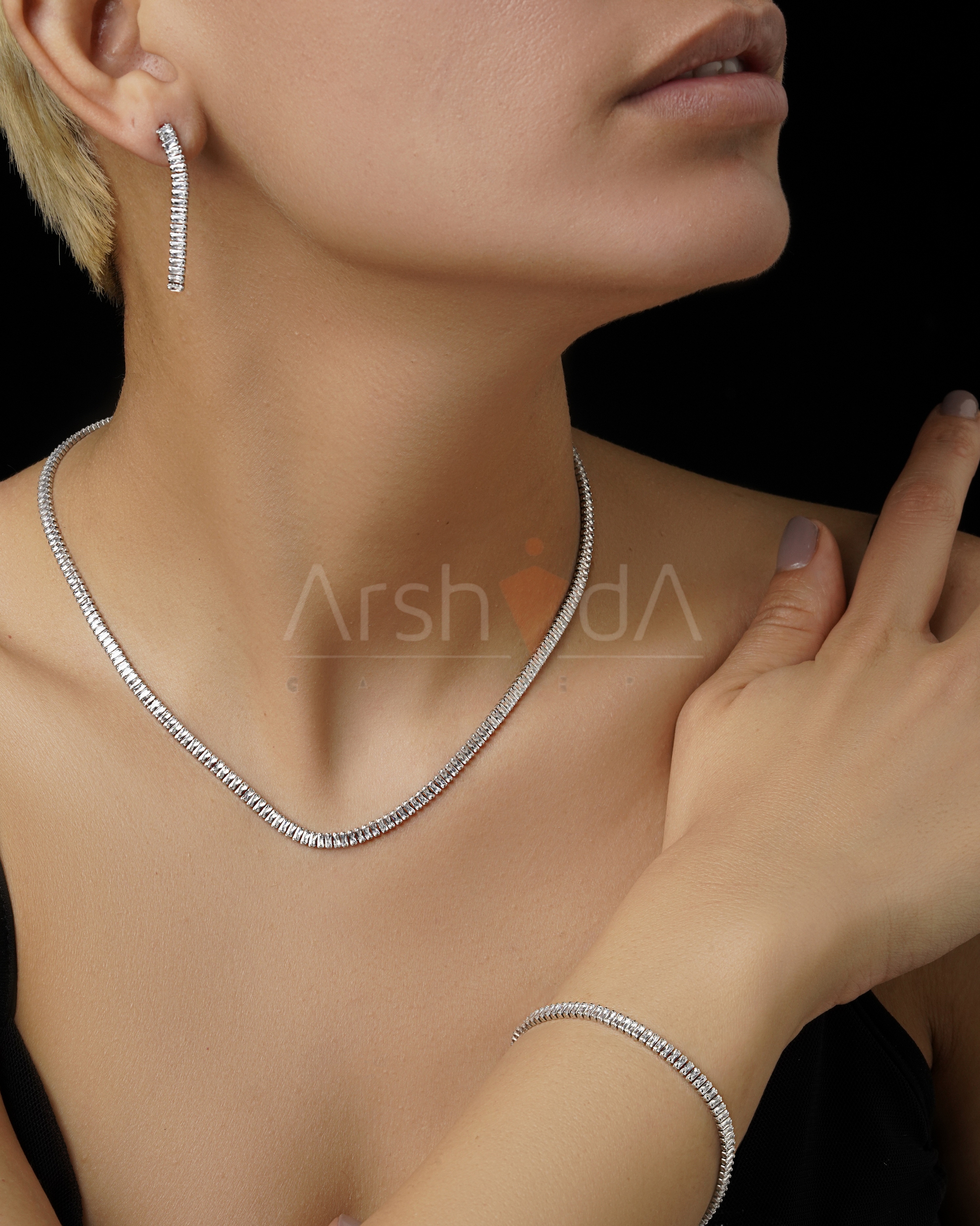 سرویس تنیسی نقره‌ای شامل گردنبند، دستبند و گوشواره با نگین‌های باگتی زیرکونیوم درخشان بر روی مدل در آرشیدا گالری.