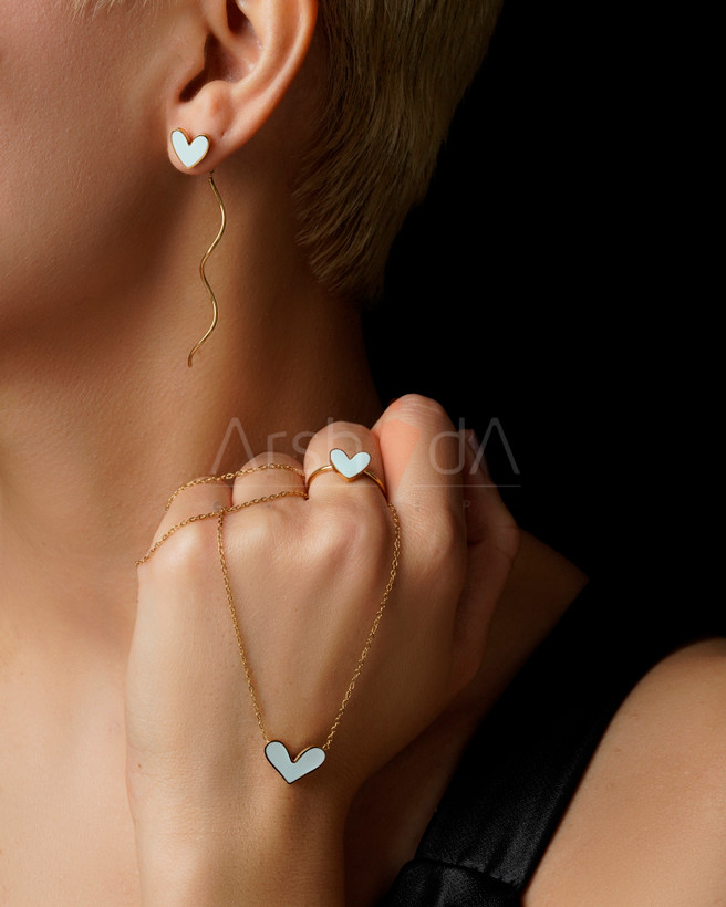 نیم ست استیل طرح قلب با میناکاری رنگی پاستلی و آبکاری طلا ۱۸ عیار بر روی دست و گردن مدل در آرشیدا گالری.